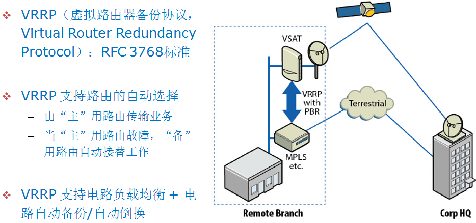 For users who require high link reliability (such as banks and securities), satellite communication can be used as the backup line for the primary terrestrial lines. HNC satellite communication system supports VRRP (Virtual Router Backup Protocol) and PBR (Policy-based routing) functions, which ease the backup for terrestrial lines.